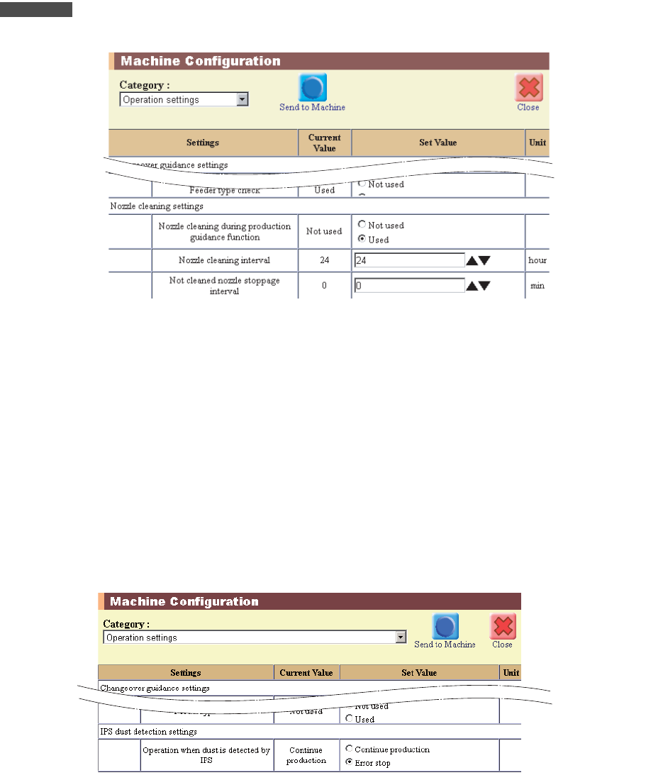 • [Not cleaned nozzle stoppage interval]: [0 to 60] 分钟 在显示了吸嘴清扫向导之后,如果超出了