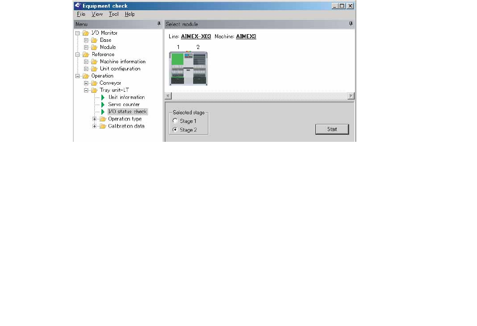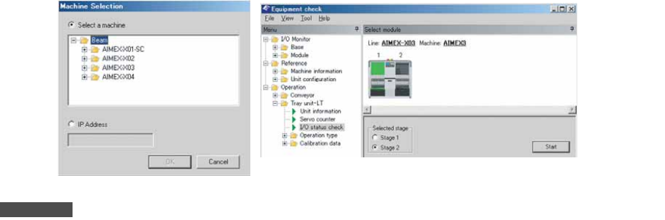 首先,在 [Machine Selection] 内选择对象机器。接着,从 EquipCheck 窗口的 [Selectmodule] 框内选择
