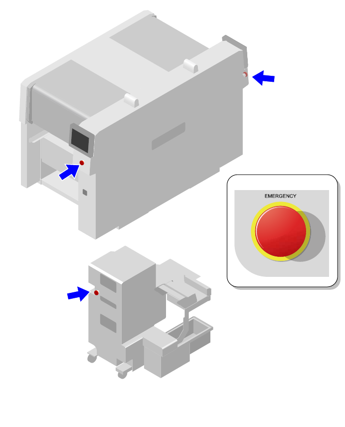 发生紧急情况时,请按下机器上红色的紧急停止按钮停止机器的运转。紧急停止按钮的位置请参照下图。