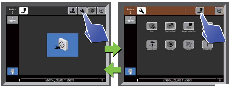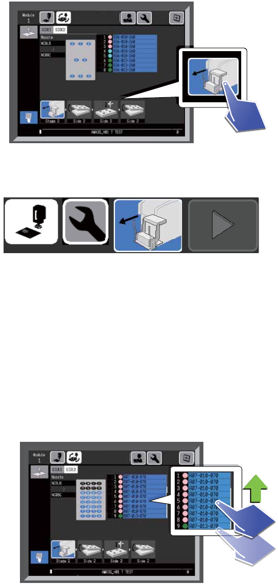 SYS-AIMEX3C-007S0 3. 基本操作 AIMEX III/AIMEX IIIc 系统手册 45 3.3.1 如何单击键 所谓按键指用白色框围住的示 意图。请点击该框。 此外,不同的机器状态所显示 按键背景色不同。 3.3.2 如何滚动列表 信息超出列表范围时,可以滚动列表 。请用手指轻拂画面。 1 白色 表示按键处于被选状态。 2 灰色 表示正在按住按键的状态。 3 蓝色 表示正在按住按键的状态。表示正在 向操作员进行作业…