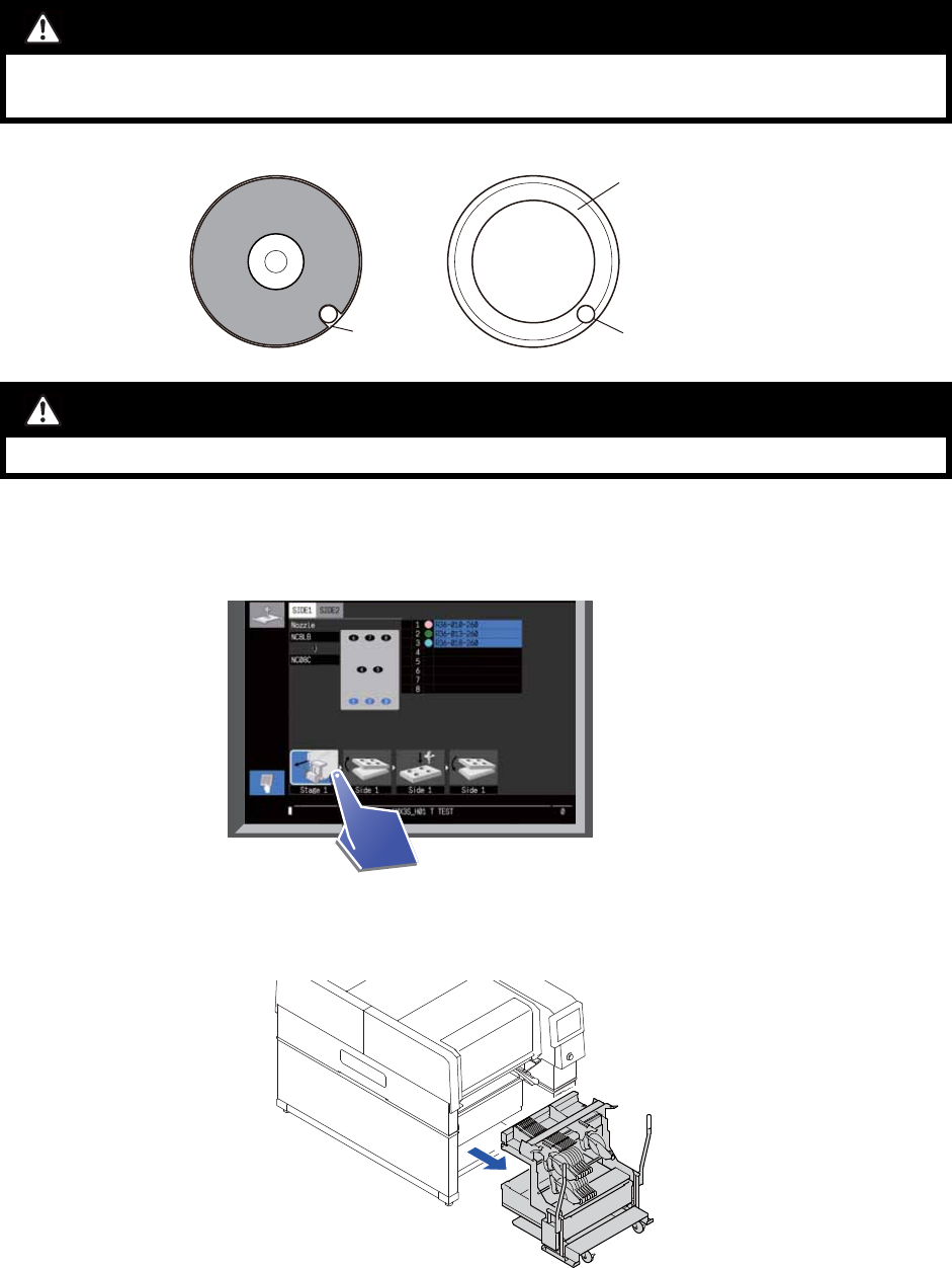 4. 生产准备 SYS-AIMEX3C-007S0 78 AIMEX III/AIMEX IIIc 系统手册 4.5.2 吸嘴的卸下和安装 请将吸嘴更换侧的操作权设置 为有效并进行以下作业。 1. 请点击 [ 卸载料站 ] 按键。 2. 请慢慢将供料单元 拉出机器之外。 注意 32 • 请将吸嘴的切口部分对 准吸嘴置放台的销后放置吸嘴。如果销与切 口部分的位置不重合,就会产生 吸嘴更换错误的原因。 注意 33 • 在合上吸嘴置放台时,请…