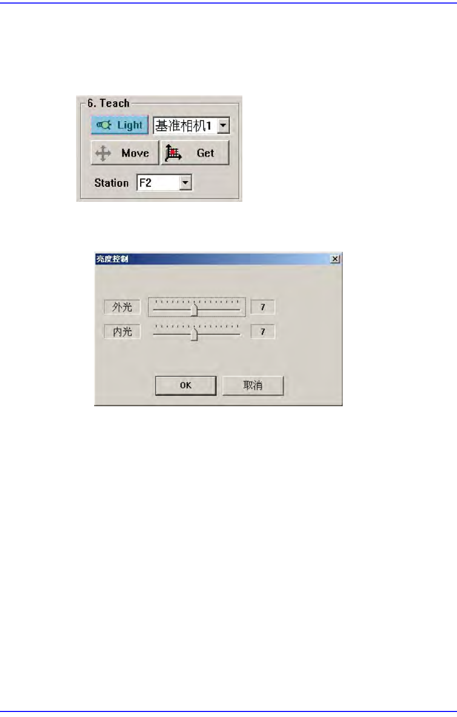 6-5 Board 定义 进行贴装原点的示教。 <6. 示教 > 领域 用于回转 XY , Z 轴驱 动电动机在组合框中选择的对象移 动到指定的坐标位置或 用于获取当前坐标位置。 <Light> 按钮 设定识别部品用 Fiducial 照相机的照明度。 按下此按钮 时, 显示以 下画面。 组合框 用于回转 XY , Z 轴驱动电动机选择移动到指定坐标 位置的对象或用于选择想 要获取当前坐标的对象。 可…