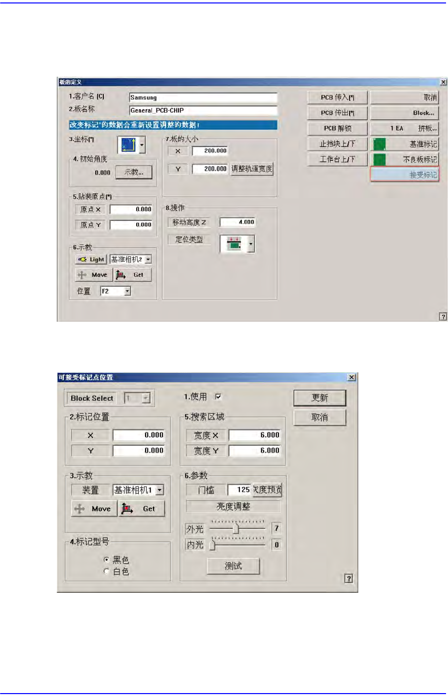 6-32 Fast Flexible Placer SM481( L) Administrator’s Guide 6.5. 接受标记 (Accept Mark) 设置 用来区分安装 s 的 PCB 的合格与否的标记为 坏标记。 坏标记 对不合格品作 标记, 但 可接受标记对不合格不作标记, 同时设备只对 可接受标记标记的 PC B 进行作业。 点击 < 接受标记 > 按钮时, 显示以下编 辑可接受标记数据的对话框。 图 6…