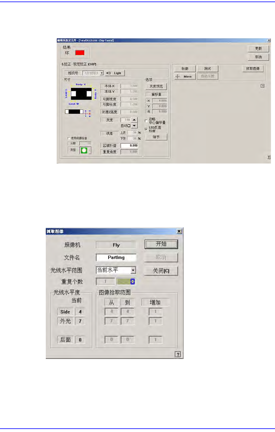 7-34 Fast Flexible Placer SM481( L) Administrator’s Guide < 自动校正 > 按钮 自动阶段性地变换部件形象, 并保存形象 , 用户确认其中识别 最好的形象照明 值进行保存, 帮助保存最佳照明值。 CHIP-Rect, TR, TR2,BGA, SOP , SOP2, SOJ, SOJ2, QFP , PLCC, Flip-Chip 等部品进 行。 图 7.9 “A…