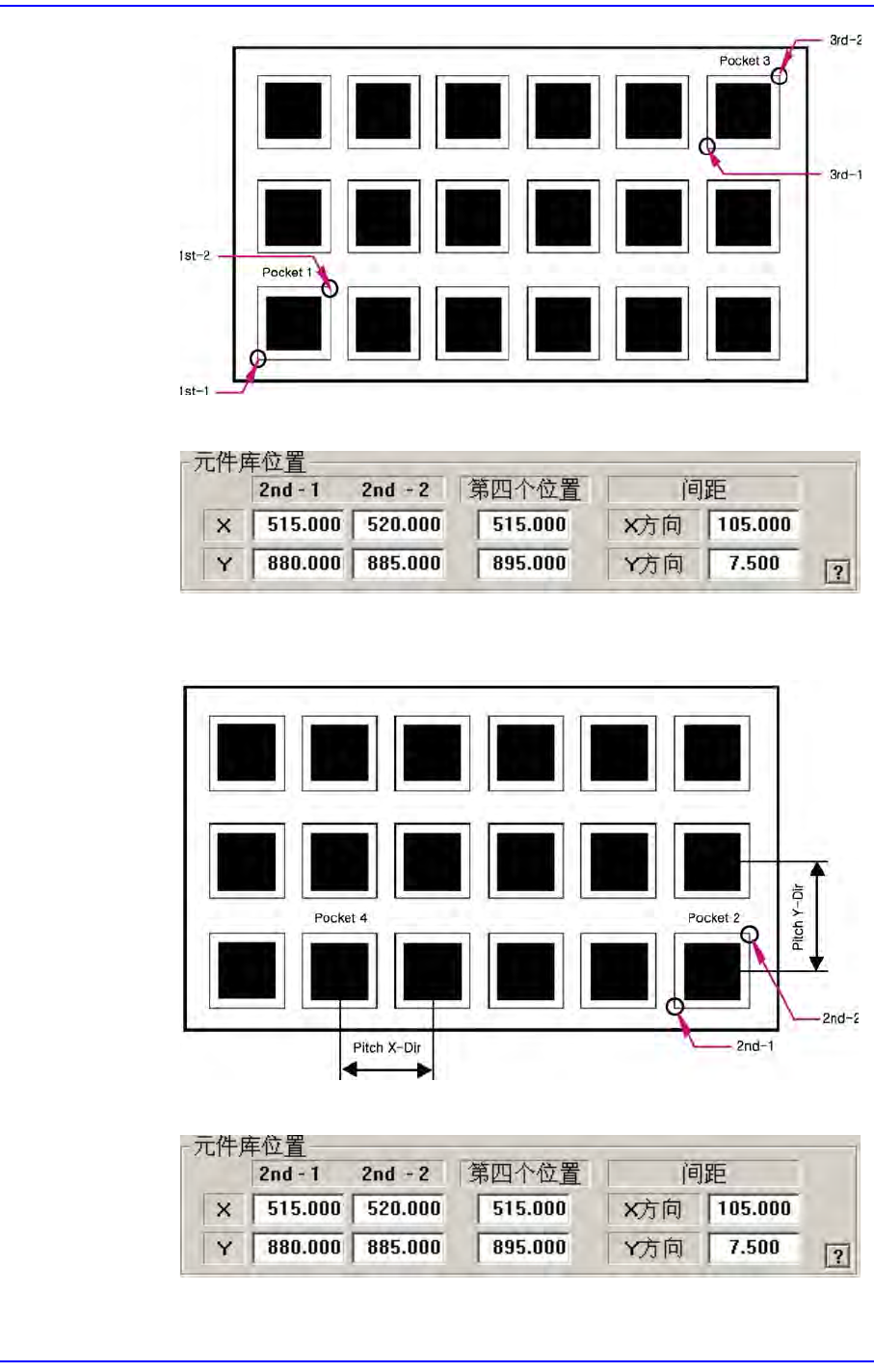 8-23 供应装置的设置 <2 槽 X- 轴 > 如下图所示一一输入任何一个 X 方向的 pocket 的中心 点坐标, 2 号 pocket 的 对角线顶点坐标, 以及 X 和 Y 方向 间距。 <2 槽 Y- 轴 > 如下图所示一一输入任何一个 Y 方向的 pocket 的中心 点坐标, 2 号 pocket 的
