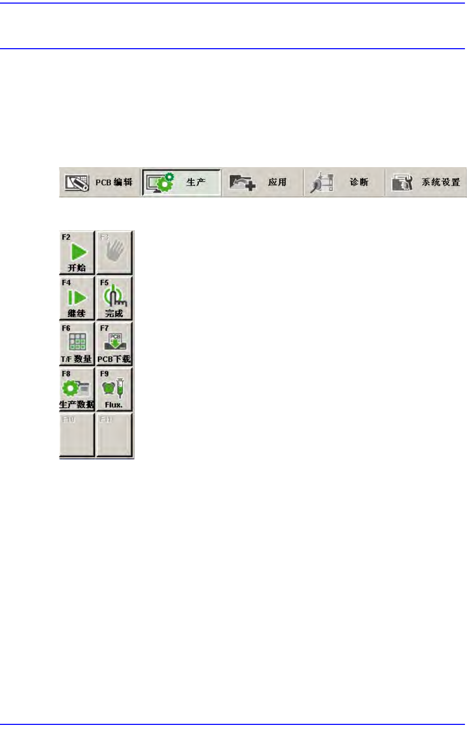 ‘生产’菜单由 开始, 停止, 继续生产, 完成, T/F 数量, PCB 下载, 生产数据 等7个子