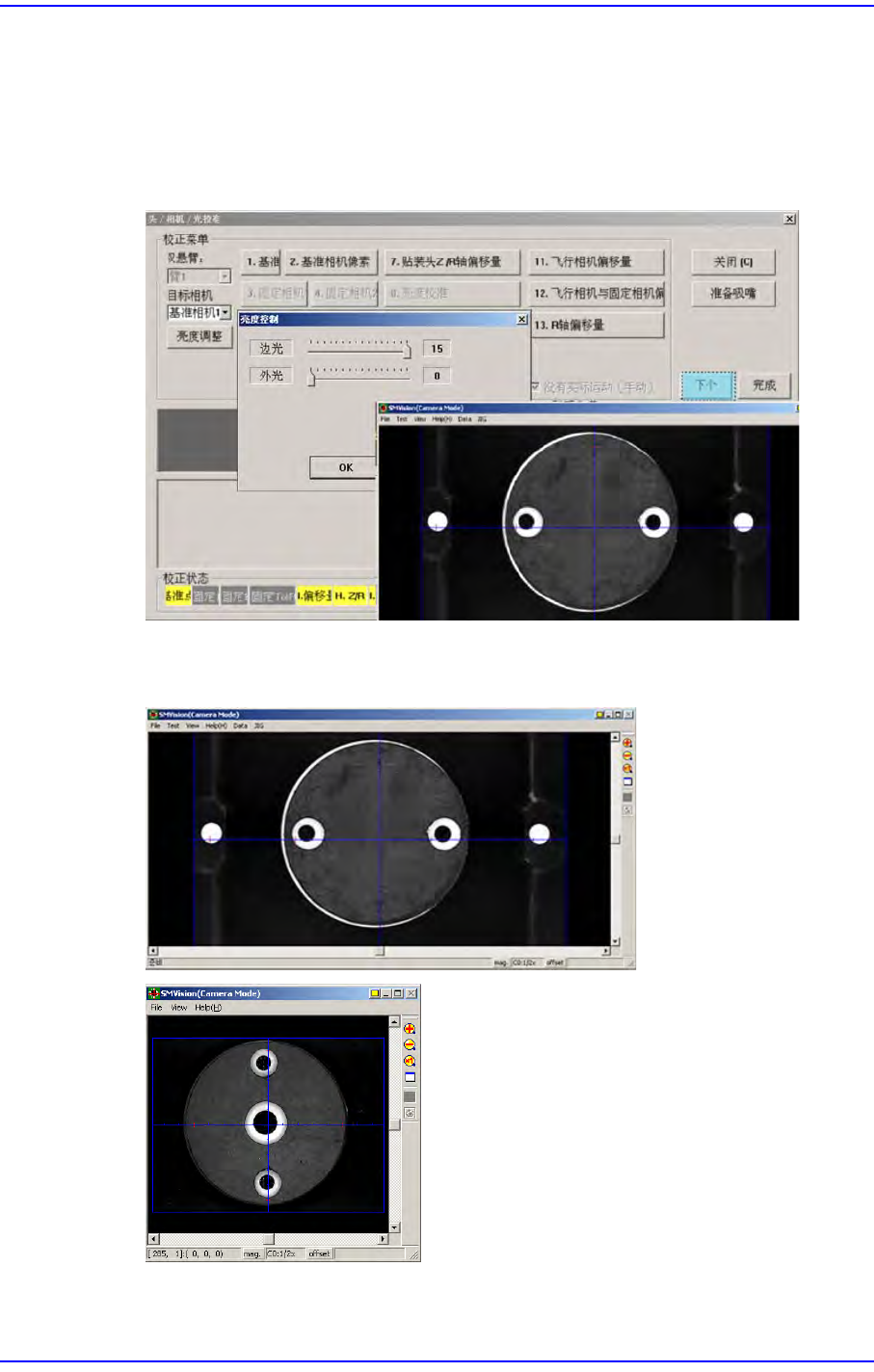 14-57 Machine Calibration 7. 那么, 磁头 1 上升到飞行相 机的 Align 高度, 关闭 Mirror 。 然后在消 息窗显示 ” 准 备标准。 8. 对于标准, 点击 [ 下一步 ].” 消息。 此时在 < 目标摄像 > 组合框中选择 ” 飞行相机 1” 点击 < 亮度 > 按钮, 在 ” 亮度 控制 ” 对话框中 SMV ison 显示的 Calibration T ool 上…