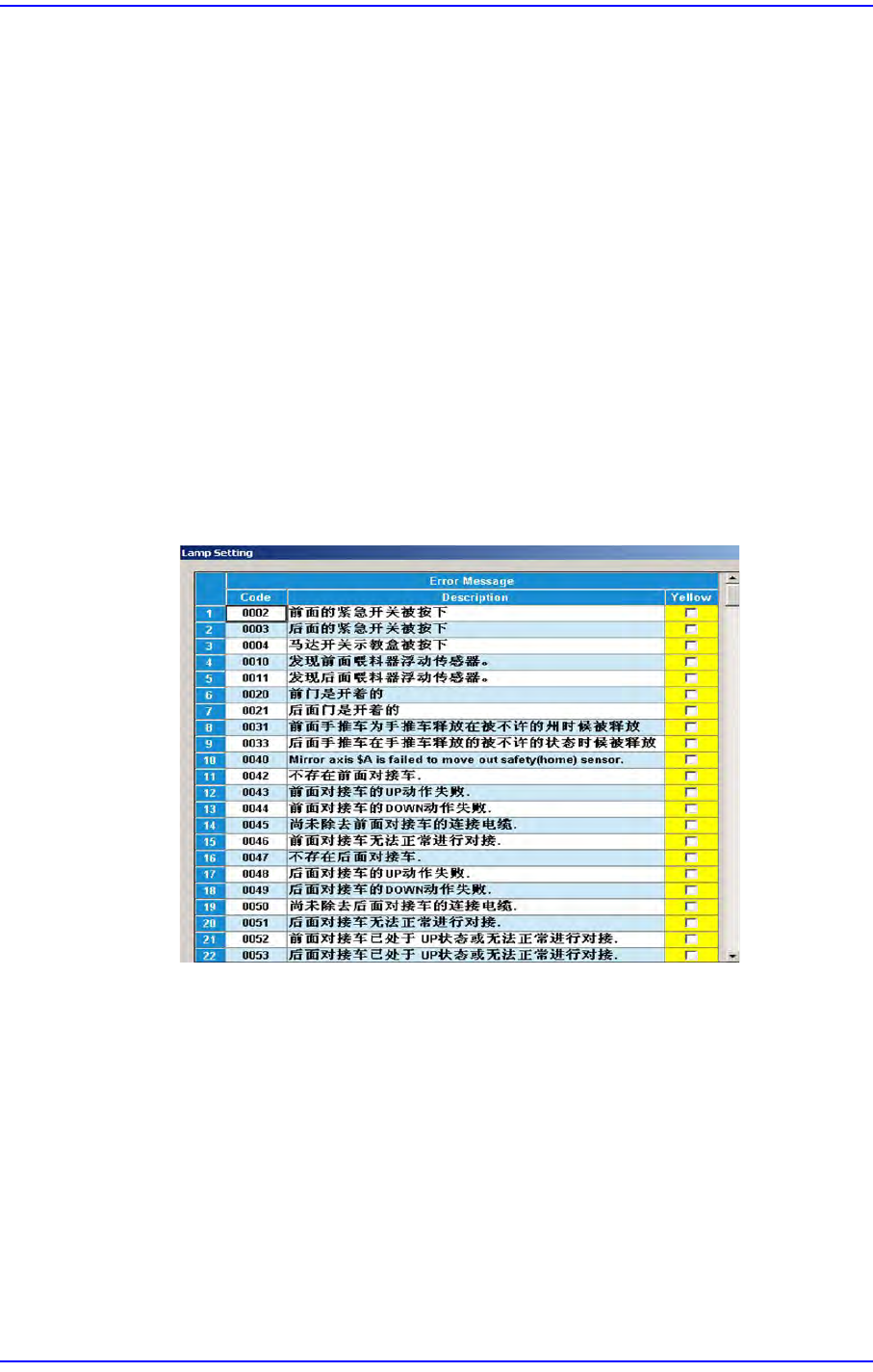 15-31 系统设置 红 - 黄色 - 绿色 : Signal T ower 灯的构成为 ” 红色 – 黄色 – 绿色 ” 的情况。 红 - 蓝色 - 绿色 : Signal T ower 灯的构成为 ” 红色 – 兰色 – 绿色 ” 的情况。 (CE 规格 ) < 标准状况 > 领域 设定显示设备的状态的 Signal Light 灯的状态。 比如说, 空闲 / 等候状态下需要开 Sig nal T o wer…