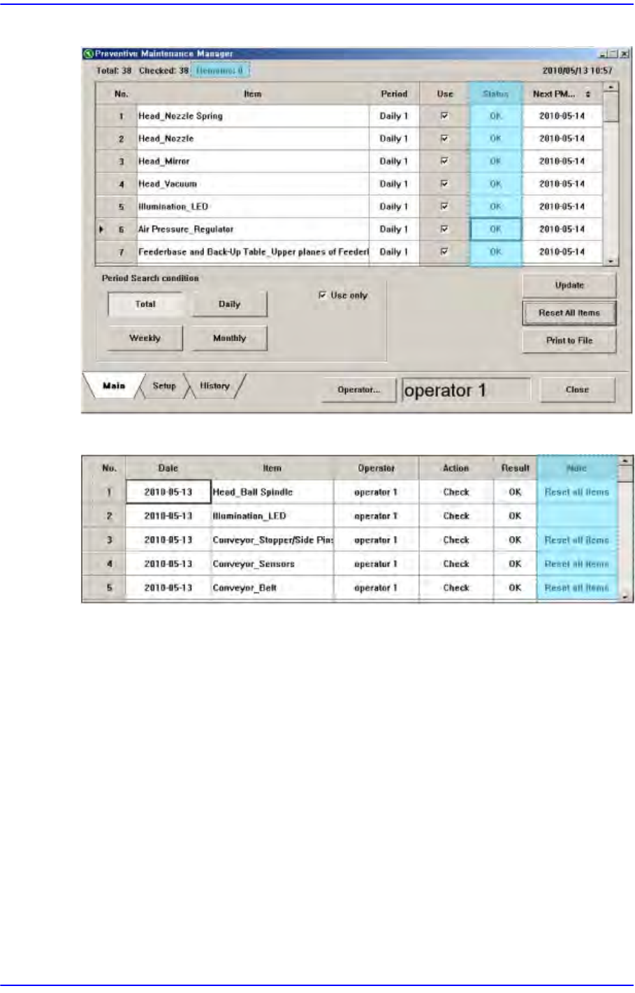 19-8 Fast Flexible Placer SM481( L) Administrator’s Guide 图 19.7 PM Manager 的 Main 画面 History 画面中记录所有变更项 目的历史, 同时在 Note 中显示 ”Reset all items” 。