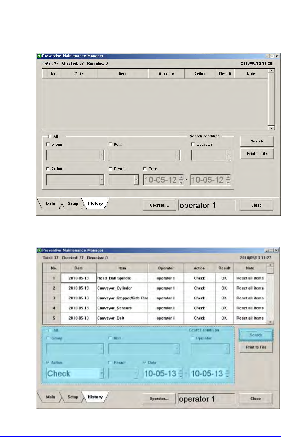 19-16 Fast Flexible Placer SM481( L) Administrator’s Guide 19.6. History 画面 在 History 画面中可查看所有检查记录。 图 19.14 History 画面 查看检查记录时, 输入检查条件后点击 <Search> 按钮。 图 19.15 检查记录查看画面