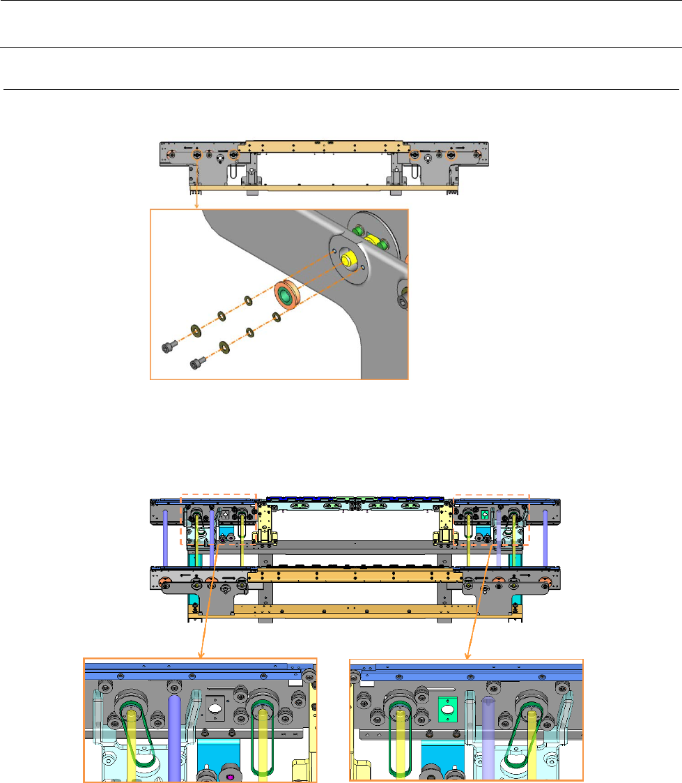 维修调整要领书 5-9 5- 5- 3 传送宽度调整联动正时皮带的更换 1 ) 松开空转皮带轮螺钉,却将空转皮带轮,松开正时皮带。 图 5- 5- 3- 1 松开空转皮带轮 2 ) 拆下 AWC 编码器 图 5- 5- 3- 2 拆下 AWC 编码器 空转皮带轮 空转皮带轮