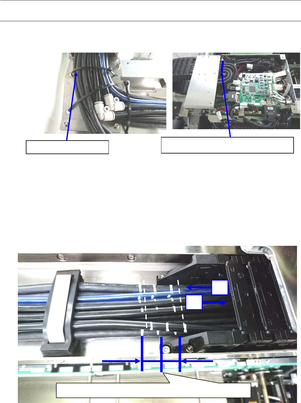 5) 调整线束,使 2 条记号的中间位置成为 X 电缆拖链的端部,再予固定。