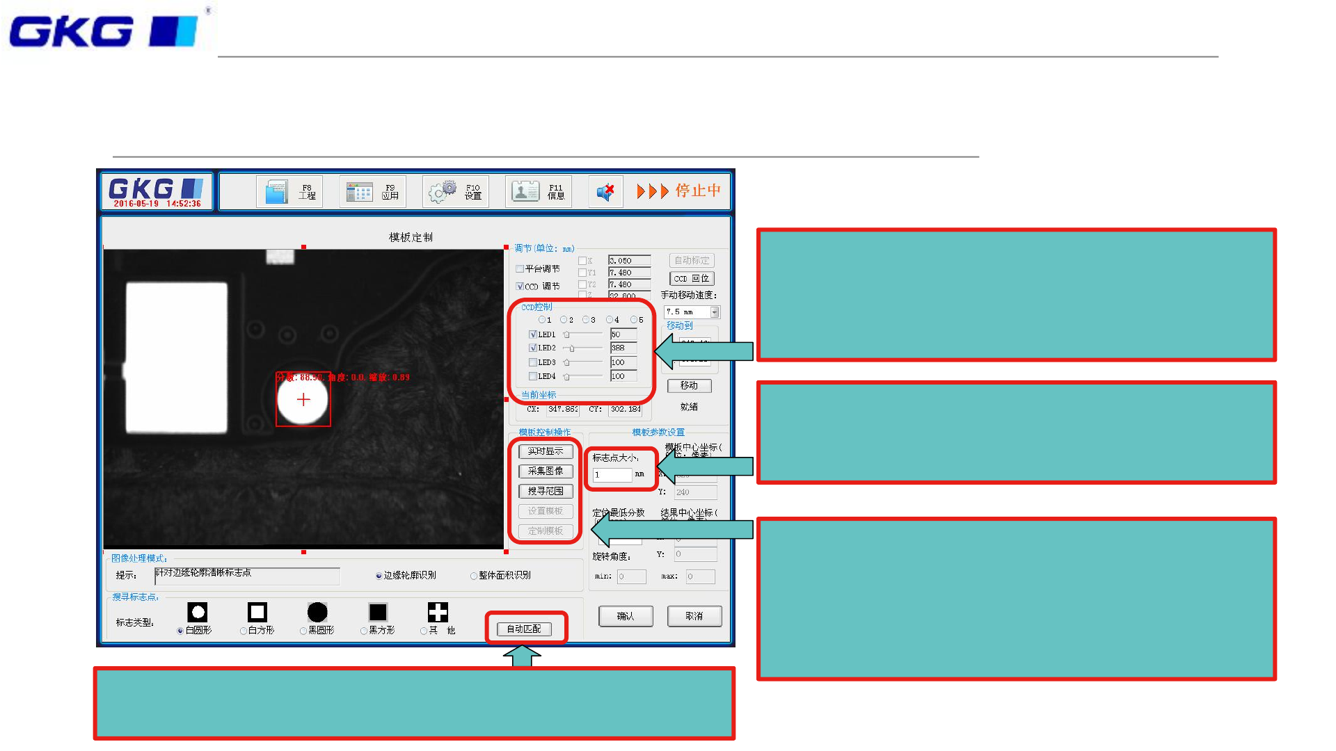 九、MARK点设 置 点击【自动定位】,匹配完成后,如图分为 83 ,分数越 高,精度补偿越高。 有些 MARK 点质量不好,自动匹配无法完成 时,可使用【模板控制操作】又称【手动定 制】,按照实时显示、采集图像、搜寻范围、 设置模板、定制模板顺序进行手动抓取 MARK 点,匹配完成后,点击确认保存 如右图为 LED 调节按钮, 1 、 2 为 PCB 调节灯, 3 、 4 为钢网调节灯,上面 1-5 的按钮,为 5 种 不同的光源,选…