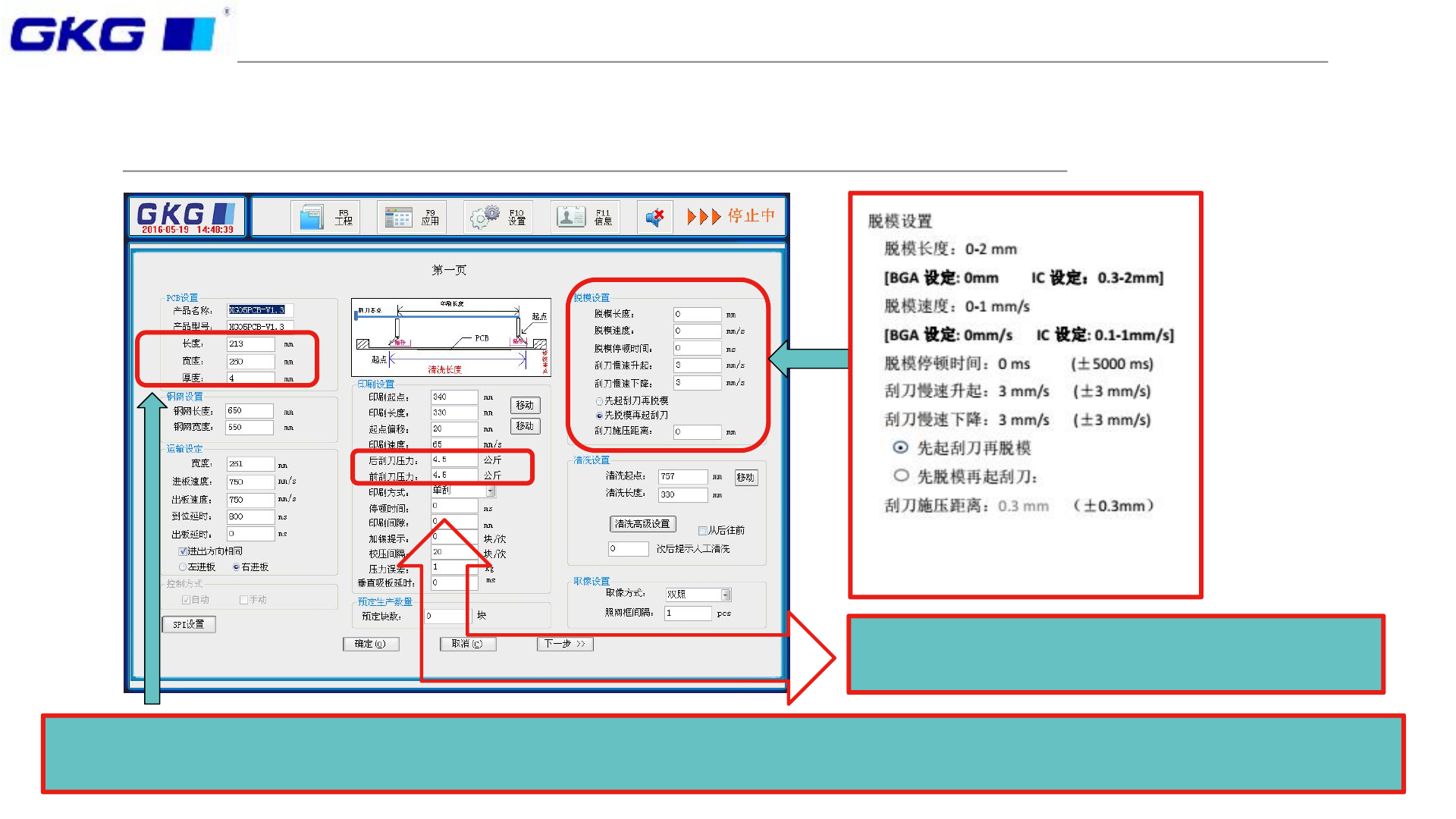 1、输入基板长、宽、厚度,软件会根据长宽厚自动计算出【导轨调宽宽度】【印刷长度】【脱模】【清洗方式】