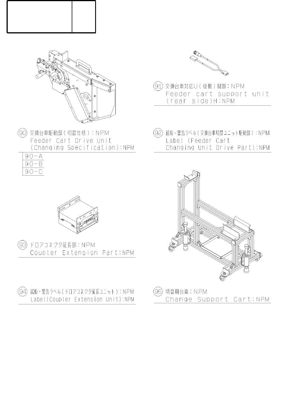 Ref No. Remark s R 1 Q'ty 89 交 換 台車切替ユニ ット駆 動部 連結:NPM Feeder Cart C hanging Unit Drive Part:NPM イラスト No. Part No. 品 名 品番 数量 R 2 パーツリスト Kit N o . キット品 番 Kit Name キット名称 N610102584AA Part Name 備 考 セクションNo. PARTS LIST S…