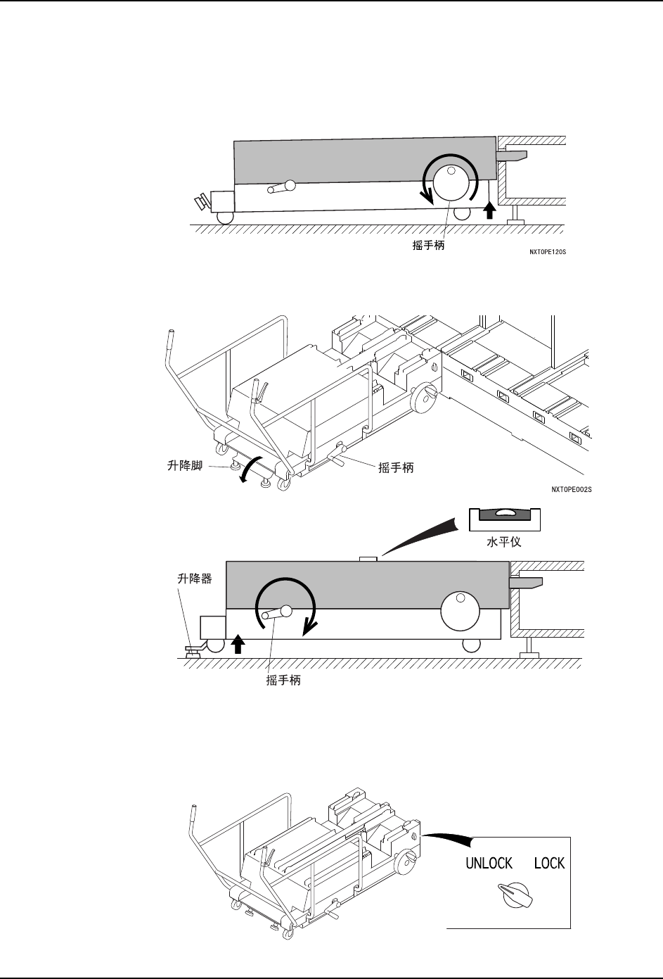 b. 同样地旋转摇手柄,提升后轮 ( 使升降脚接触地面 )。一边看水平仪,一边尽可能使