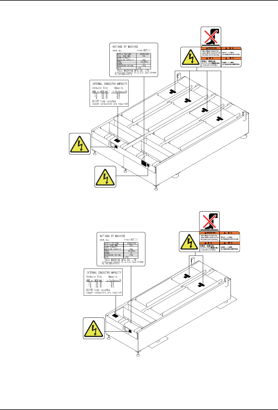 表示使用机器时的注意事项的安全标识贴在机器的下图所示位置。请仔细阅读记载内容,