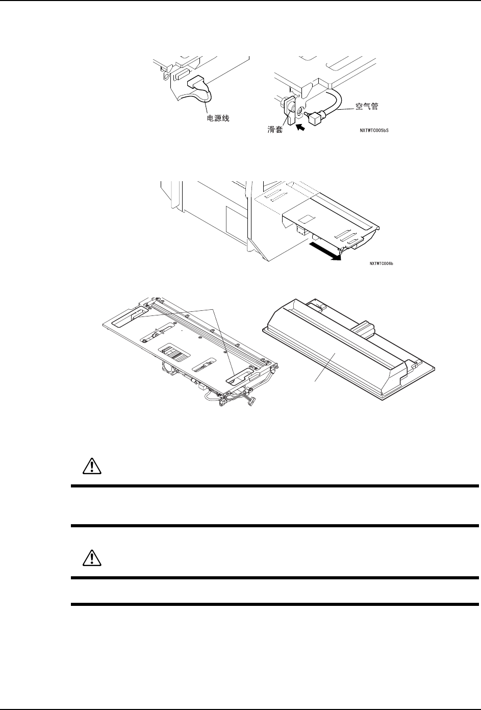 7. 拆除连接在废料带处理单元右侧的电源线插头,将空气管和滑套向下图箭头方向滑动并