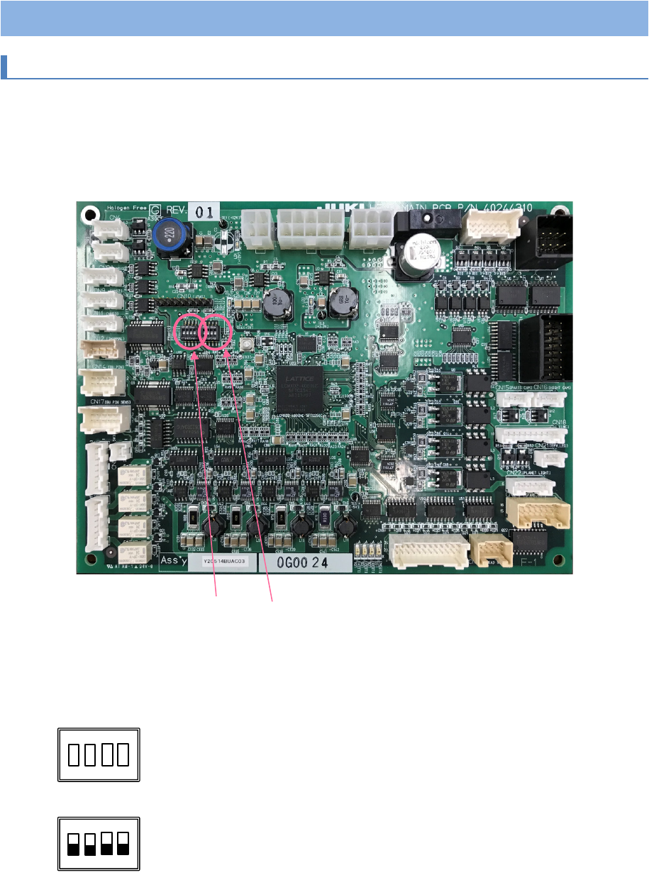 第 4 章 设置图 4- 10. HEA D MAIN PCB A SM 设置 15 4- 10. HE AD M AIN PCB A SM 设置 4- 10 - 1. HEAD MAIN PCB ASM 设置 (40244310) 【功能】 HEAD M AIN PC B ASM 是控制 P20 贴片头的 I/O 及摄像机照明 等的基板。在 L 侧和 R 侧使用 2 枚。 【电路板的外观】 【开关的设置】 拨码开关在交货时已设 置好,…
