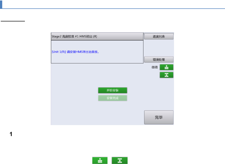 第 2 章 操作顺序书 2- 3. 校准 59 2-3- 2. 高度校准 HMS 转写 Stage1 的处 理 完成 后, 显示 如下 画面。 首先把 基板翘曲检测传感器转 写 调整治具 板安装 到右侧装置上 。 触摸[开始安装]。 进行左右一次性更换台 车上升、前面护罩的 锁定后, XY 轴退避,根据 治具 板的 尺寸 对前侧通道 的传送宽度自动进行宽 度调整。然后,进行 左右一次性更换台车 下降、前面 护罩解除 锁定。 通道宽度需要…