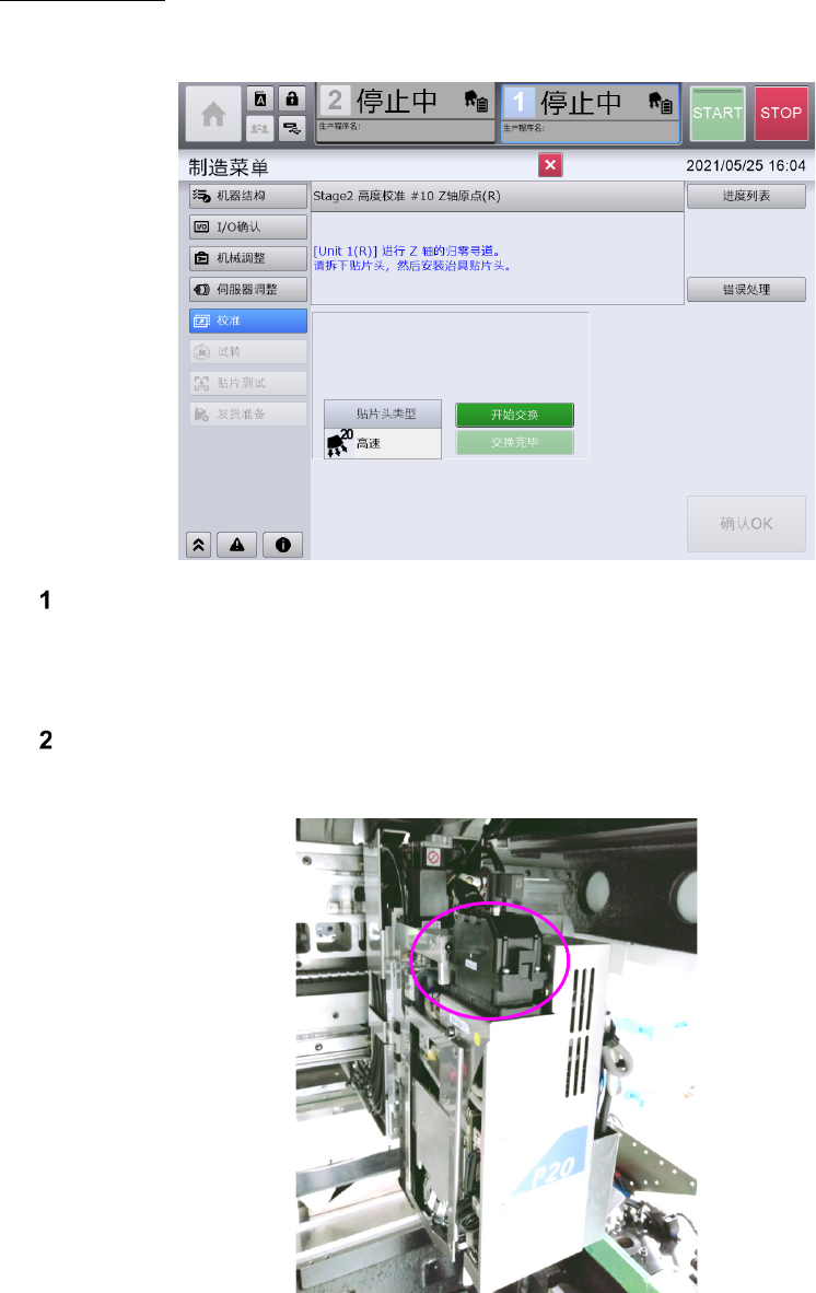 把治具芯片安装到转写校准工具放置台上的操作完成后,显示如下画面。拆下右侧装置的贴片头,安装