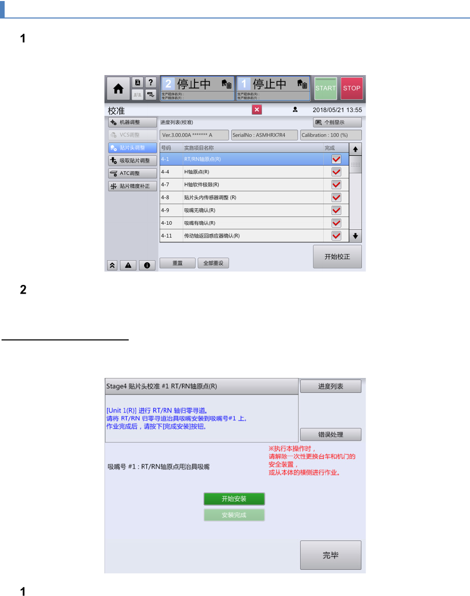 第 2 章 操作顺序书 2- 3. 校准 74 把确定 RT 轴/ RN 轴原点用的治具吸嘴安装到右侧装置的 吸嘴号 #1 。 注意 • 进行这一装置 内作 业时,请解除一次 性更换台车和前面 护罩的 锁定 ,在护罩打开的状 态下作业或者从机器侧 面 进行 作业。 治具吸嘴要一面旋转 一面嵌入 。旋入到有咔嚓一声 的感觉后,请轻轻向 下拉,确认不会脱出 。 关闭前面护罩,触摸[安装完成]。 触摸[完毕]。 显示 RT 轴/ RN 轴进行…