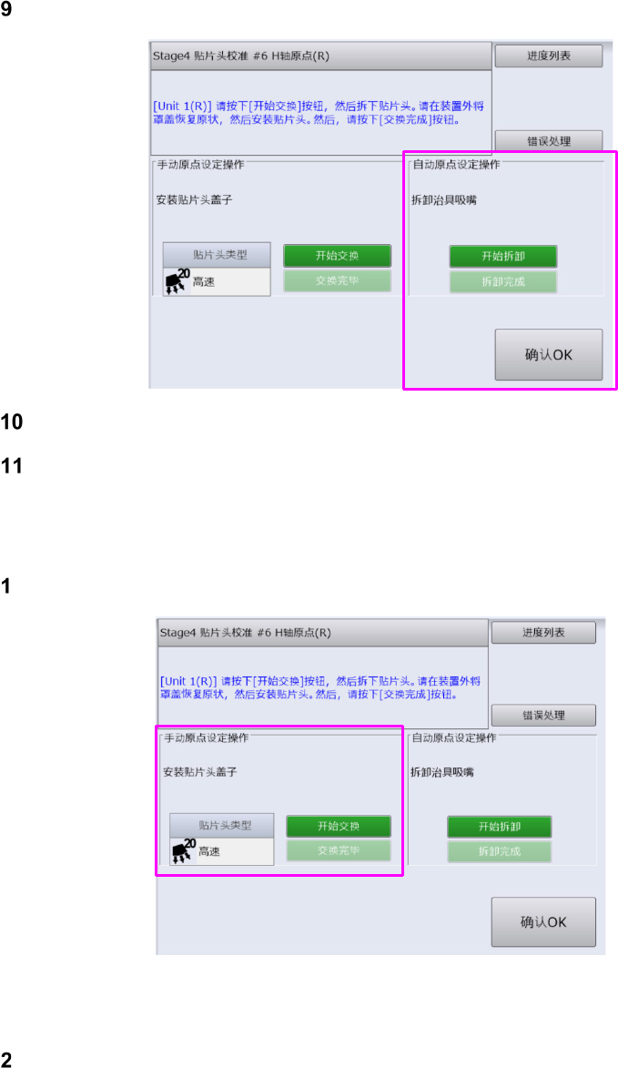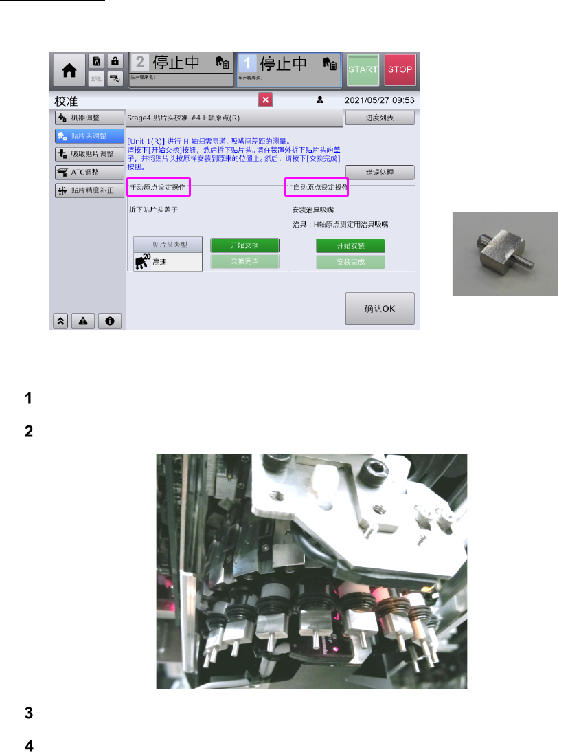 第 2 章 操作顺序书 2- 3. 校准 77 触摸[自动原点设定]。 执行校准,显示测定结果。 以 #1 ~ # 20 中测定值最高的 吸嘴号为基准,距之 0.05 mm 上侧的 H 轴位置就是 H 轴的原点。 在[吸嘴间差距测定结 果]画面上,以列表 形式显示测定过的各 吸嘴号与 H 轴原点的距离 (差距)。 确认各吸嘴号的差距值测定正确没有问题后,触摸[关闭]。 请确认差距值的最大值 与最小值之差在 0.2 mm 以内。 触摸[确…