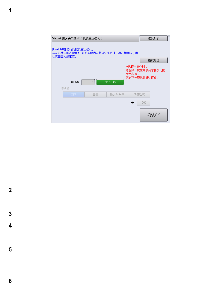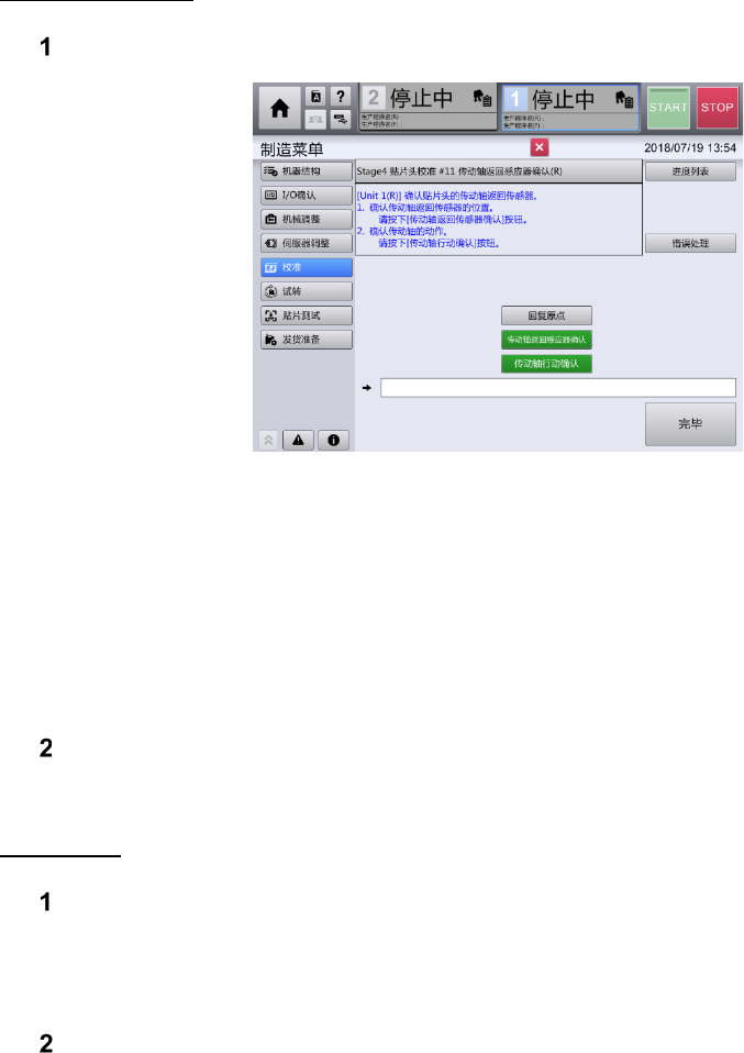 第 2 章 操作顺序书 2- 3. 校准 87 轴返回感应器确认 触摸[ 传动轴返回感应器 确认]。 进行左右一次性更换台 车 上升 、前面护罩的锁定后, 旋转 转塔 ,对 吸嘴号 #1 ~ # 20 确认以下动 作。 -如将 H 轴 下降 4 mm ,传感器变为 OFF -如将 H 轴恢复到 0 mm ,传感器 变为 ON 如传感器对全部吸嘴号 都正常反应,画面下 方的结果显示栏内显 示[正常]。如有 错误, 显示 该吸嘴号名。 发生…
