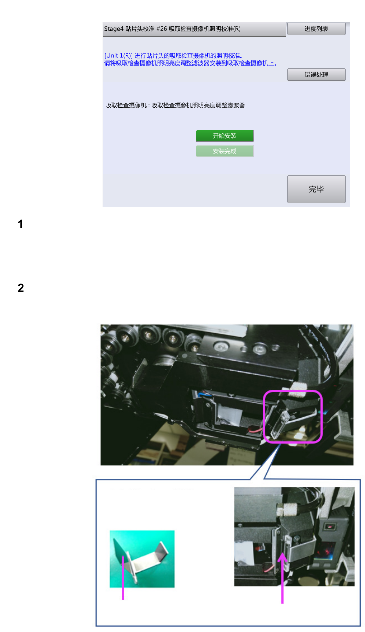 元件摄像机的像素率确定完成后,显示如下画面。进行吸取检查摄像机校准工具的安装。