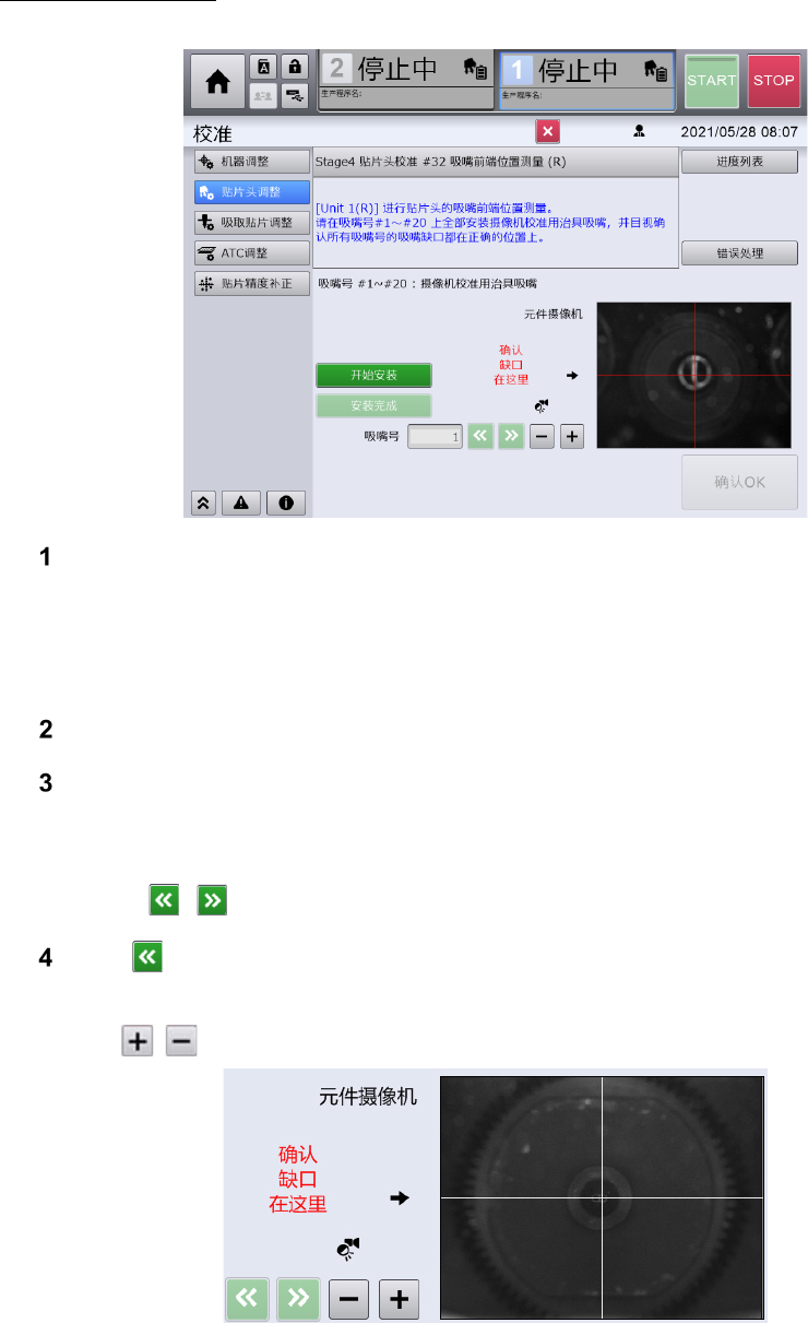 打开前面护罩,把摄像机校准用治具吸嘴安装到全部#1 ~ #20 的 吸嘴号上。