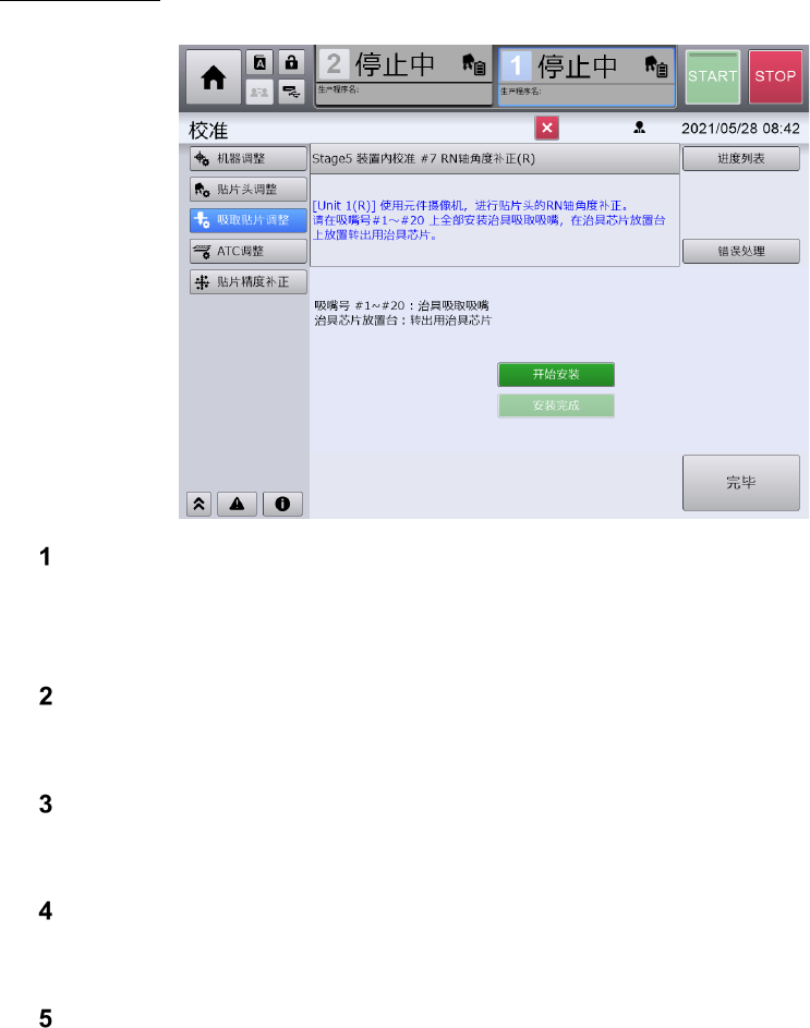 第 2 章 操作顺序书 2- 3. 校准 108 触摸[开始安装]。 进行左右一次性更换台 车上升、前面护罩的 锁定后,贴片头向安 装位置移动, RT 轴的转塔向吸 嘴号 #1 的位置旋转。然后 进行左右一次性更换台 车下降、前面护罩解 除锁定。 打开前面护罩,取下吸嘴号 #1 ~ 20 上安装的治具吸嘴和玻璃芯片 (7x7) 。 关闭前面护罩,触摸[拆卸完成]。 进行左右一次性更换台 车上升、前面护罩的 锁定。 触摸[完毕]。