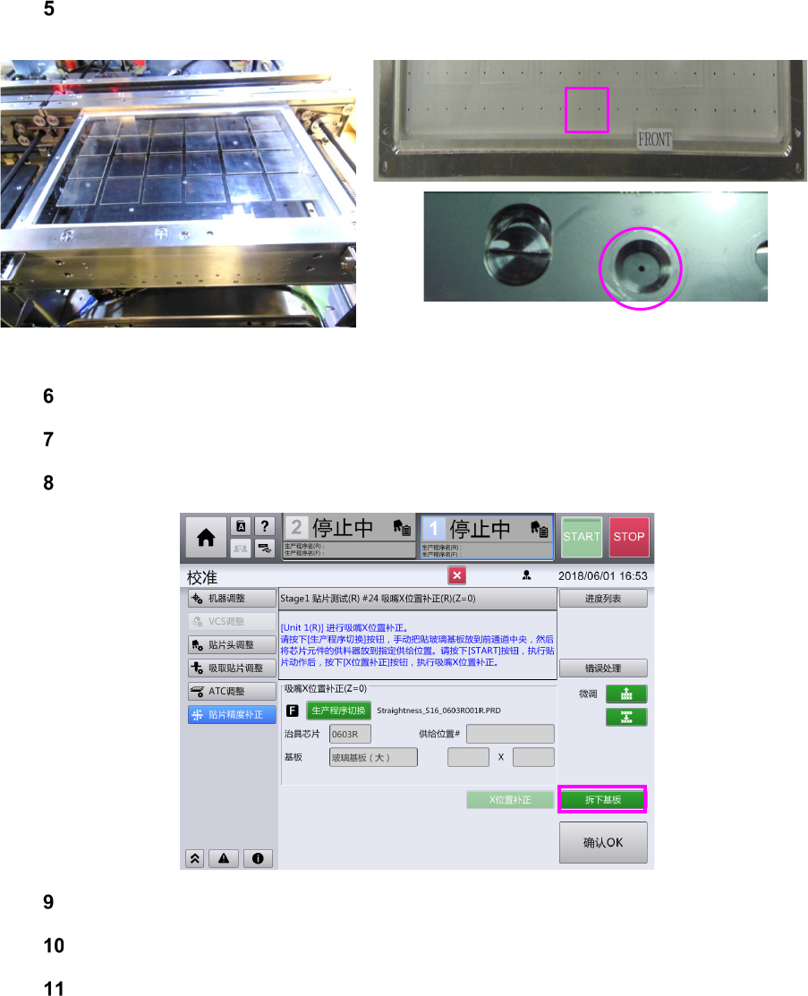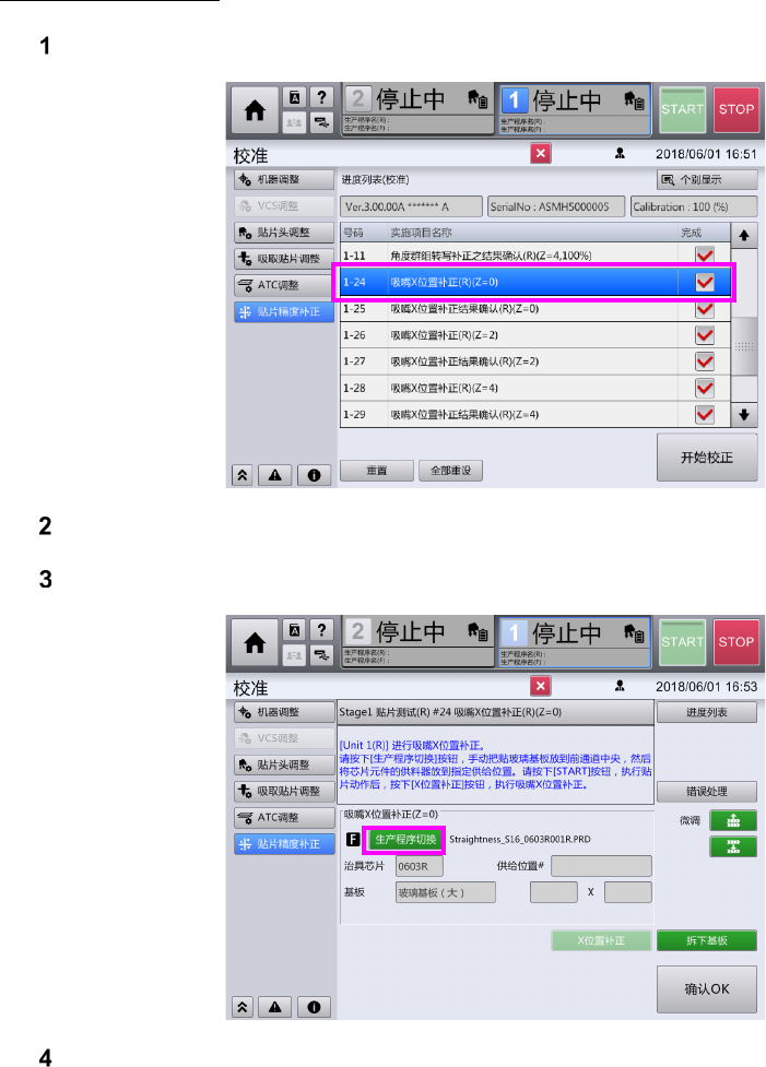 长按[START],开始贴装。贴装结束后,按[X 位置补正],执行补正。