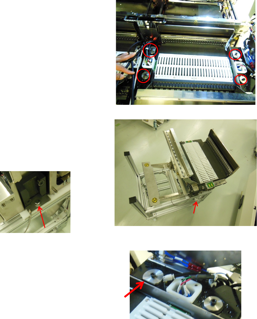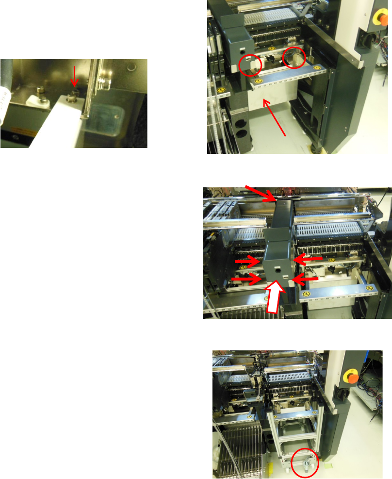 第 2 章 操作顺序书 2- 4. 维护 191 3. 取下固定台架板。 松开两侧的螺丝。 里面的螺丝 4. 拆下中央的护罩。 螺丝 5 处 两侧各 2 处 上侧 1 处 5. 设置治具台车,然后按 下挡块使其 无法移动。