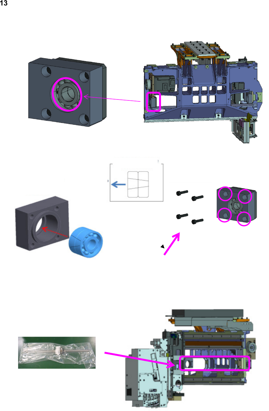 第 2 章 操作顺序书 2- 5. 配件更换 225 ③ 将 X 轴滚珠丝杠斜 向插入组装 X 轴滚珠丝杠轴固定侧轴承支架的安装作业 ① 将 X 轴轴承支架予 以固定 安装滚珠丝杠 注意事项 在固定滚珠丝杠之前, 要把贴装头移动到中 间位 置,进行滚珠 丝杠 的临时性支撑。 ※为了防止滚珠丝杠变 形,要进行临时性支 撑 将轴承支架予以固定
