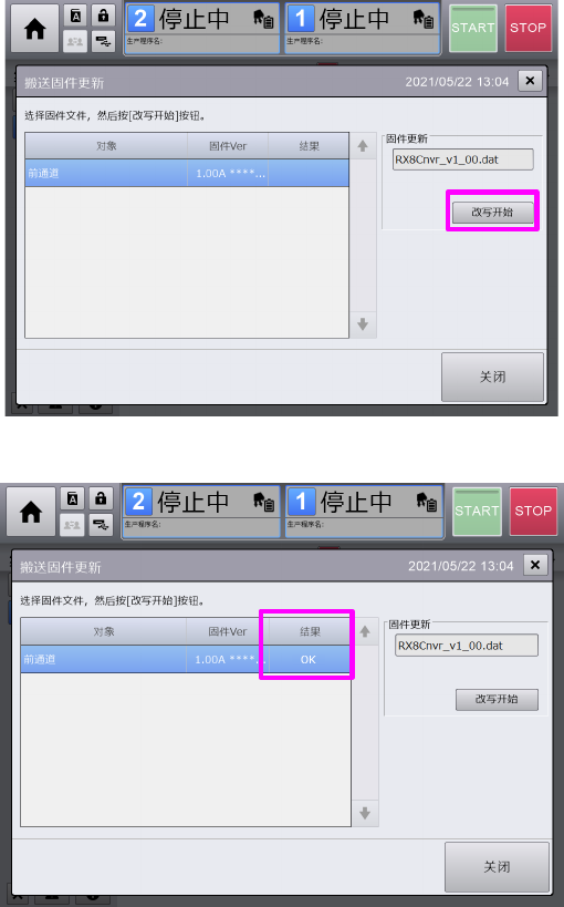 切换至搬送固件更新画面后,按下[改写开始]开始固件的更新。