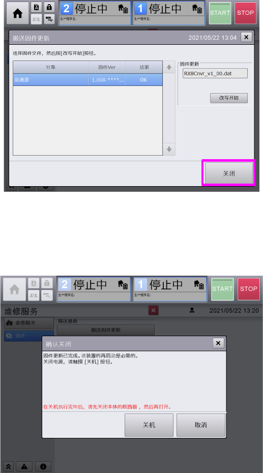 固件更新结束后,按下[关闭]则关闭搬送固件更新对话框。