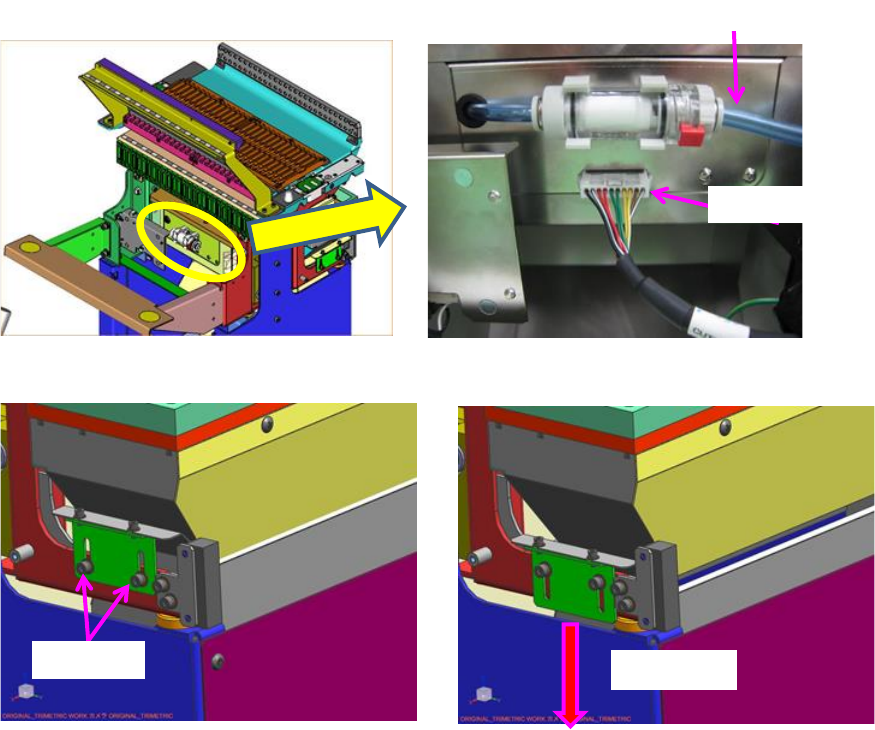 第 2 章 操作顺序书 2- 5. 配件更换 235 8. 拔下空气 管。断开连接电缆 。 9. 松开螺丝 所示。向下按压部 件(显示为绿色)。 10. 抬起切割器单元的前部 取下切割器单元。 拆下空气管 拆卸连接器 螺丝× 4 低了下去
