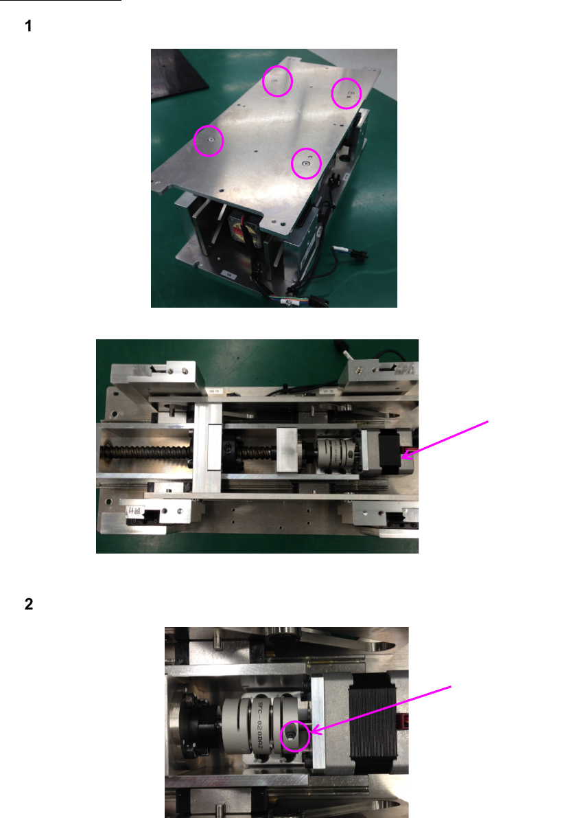 第 2 章 操作顺序书 2- 5. 配件更换 242 松开电动机托架的固定螺丝 ×4 个,连同托架一起拆下电动机。 安装电动机时,请在电动机托架固定螺丝临时旋紧的状态下,松开联轴节之滚珠丝杠 侧的螺丝,将联轴节左右移动,在平稳移动的位置上 旋紧电动机托架固定螺丝。并且, 要固定联轴节时,请在电动机托架与联轴节之间隙为 5mm 的位置上固定。