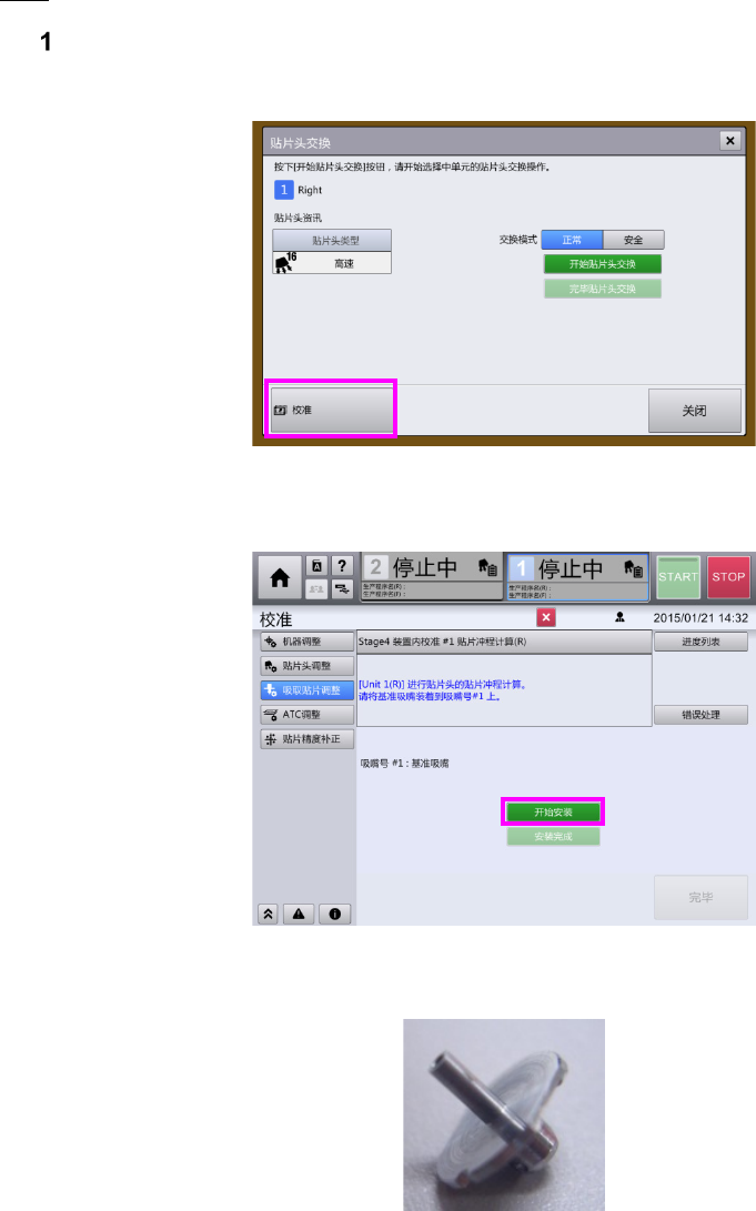 1) 画面下侧显示“完毕贴片头交(更)换”后,进行校准。