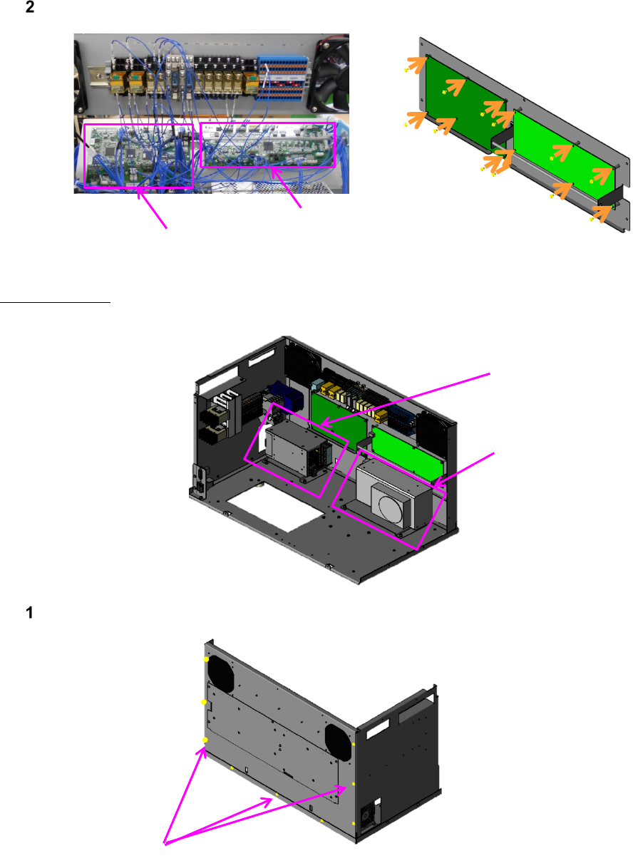 第 2 章 操作顺序书 2- 5. 配件更换 264 将基板上连接的缆线取下后,再取下对象螺丝,更换为新基板。 电源单元的更换 取下电装 BOX 背面的 9 个螺丝,取下电装 BOX 的背板。 SAFET Y PCB A SM E BAN K RELAY PCB A SM PS2 : DC48V PS 1: DC24V 螺丝