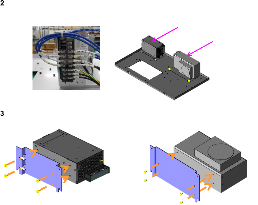 将各电源单元上连接的缆线取下后,再取下各托架的 2 个螺丝,将托架从底板上取下。