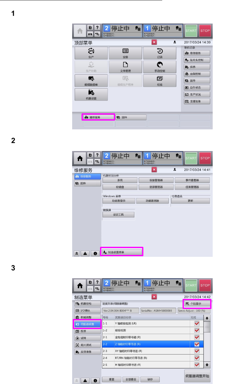 依次选择[伺服器调整]>[Z 轴临时归零寻道]>[个别显示]。