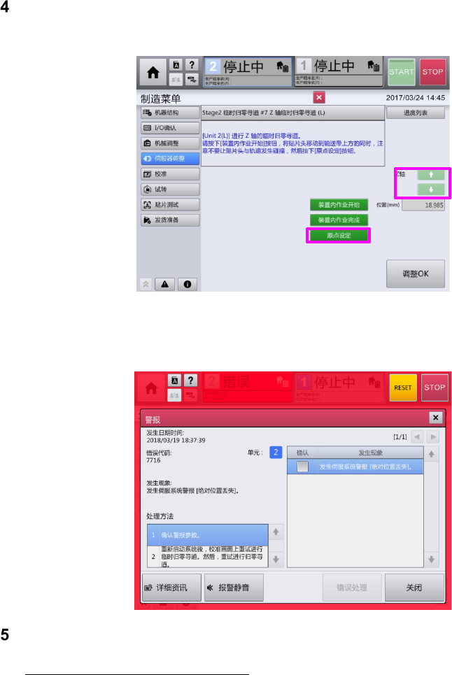 第 2 章 操作顺序书 2- 5. 配件更换 280 将 X 轴单元推到指定的位置,将贴片头移动到基板按压的上部。 请按伺服调整画面中的 箭头进行调整,使基 板按压与贴片头的间 隙为 2 ㎜。 如果 4 的作业中超过了软件 极限时,请 RESET 错误,按下临时 原点,重新进行贴 片头底面与 基板按压上表面的间隙 调整。 间隙达 2mm 后,请按 “ 原点设定 ” ,按 “ 调整 O K” 。 拆下贴片头。 间隙