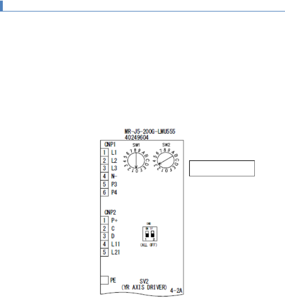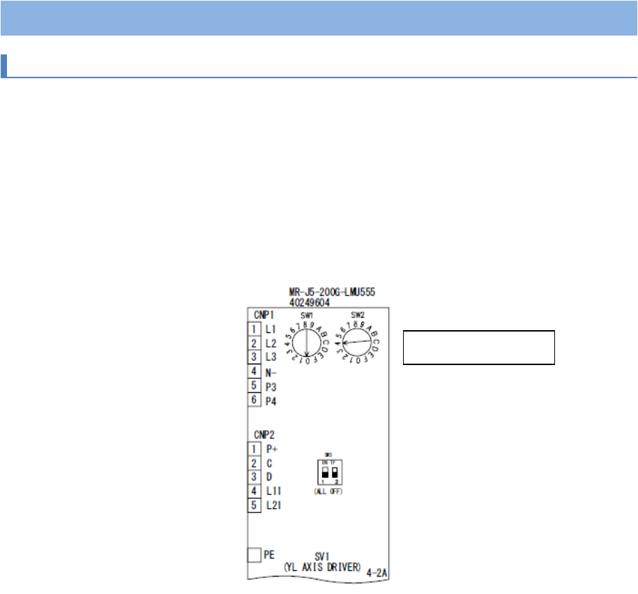 第 4 章设置图 4- 1. 伺服装置的设置 2 4- 1. 伺服装置的设置 4-1- 1. SERVO DRIVER SV1 设置( 40249604 ) 【功能】 SERVO DRIV ER (SV1) 用于 驱动 Unit L 的 Y 轴线性马达,是 三菱 电机株式会 社生产的伺服驱动器 。 【开关的设置】 更换伺服放大器时,必 须使用伺服放大器的 旋转式开关( SW 2 )进行轴选择设 置。 打开伺服放大器前面板 上部的罩盖,旋…