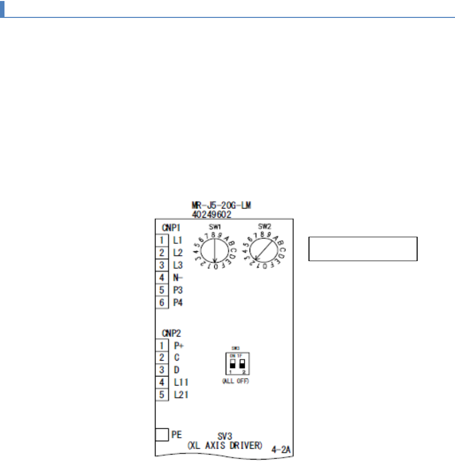 第 4 章设置图 4- 1. 伺服装置的设置 4 4-1- 3. S ERVO DRI VER SV3 设置( 40249602 ) 【功能】 SERVO DRIV ER (SV3) 用于 驱动 Unit L 的 X 轴线性马达,是三 菱电机株式会社生 产的伺服驱动器。 【开关的设置】 更换伺服放大器时,必 须使用伺服放大器的 旋转式开关( SW2 )进行轴选择设 置。 打开伺服放大器前面板 上部的罩盖,旋转用 于选择轴的旋钮开关 ( …
