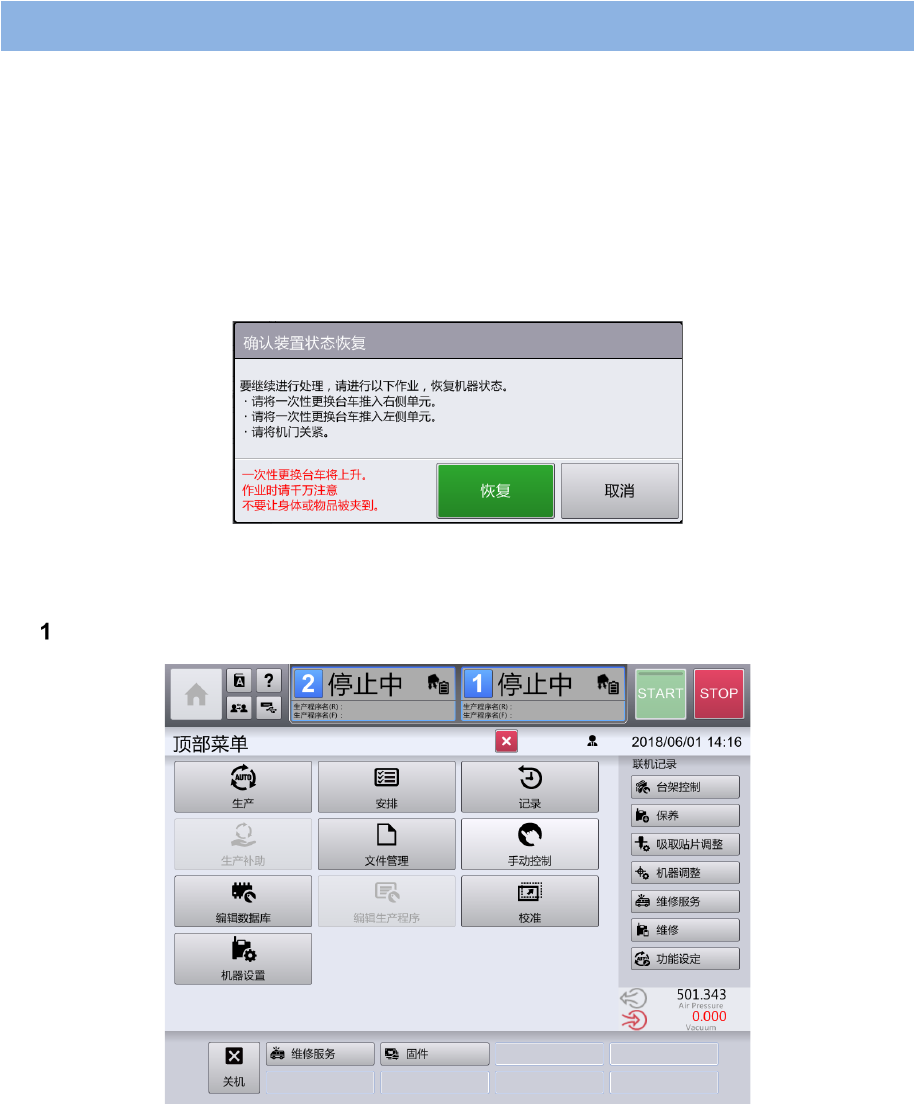 状态恢复]画面。出现这一画面,请触摸[恢复]进入下一工序。并不是所有的一次性更换