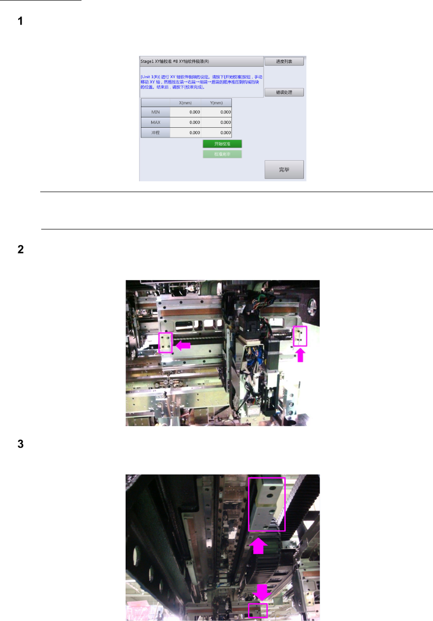 第 2 章 操作顺序书 2- 3. 校准 57 XY 轴的软件极限 触摸[开始校准]。 进行左右一次性更换台 车 下降 、前面护罩 解除 锁定。 注意 • 进行这一操作期间,不 能向其他画面移动。 打开前面护罩,用手移动 XY 轴的 X 轴,使与装置内左端的机械限动器接触,接着将 X 轴向右移动,与右端的机械限动器接触。 用手移动 XY 轴的 Y 轴,使与装置内前端的机械限动器接触,接着将 Y 轴向后移动, 与后端的机械限动器接触。