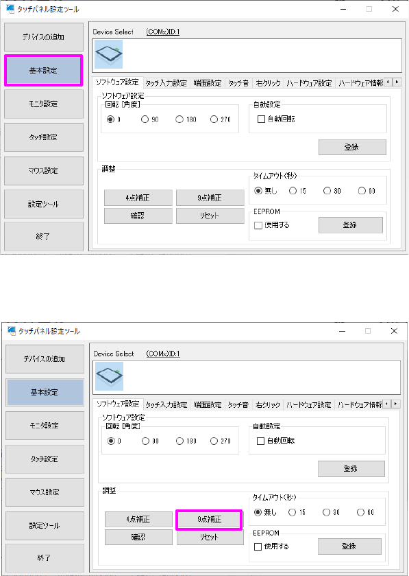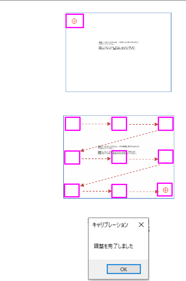 第 1 章 作业顺序书 1- 1. 系统软件的安装 5 4. 根据画面的指 示,从左上方开始依次 触摸画面 上显示的红色⊕ 标记 ,共 9 处 。 (注意)触摸操作时间太短会没有反应。触摸操作请长按1秒以上。 ↓ (依次触摸 9 处) ↓(调整完毕) 5. 触摸[ OK ]后校准结束 。 返回[制造菜单]画面。