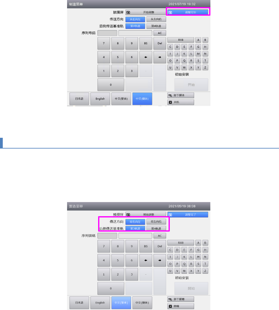 在[制造菜单]画面上选择传送方向以及后侧传送的基准轨道。
