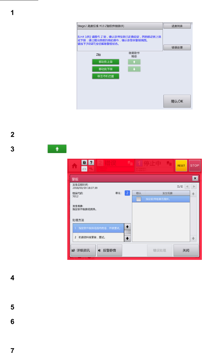 第 2 章 操作顺序书 2- 3. 校准 69 Z 轴软件极限 触摸[移动到上限]。 进行左右一次性更换台 车上升、前面护罩的 锁定后, Z 轴移动到软件极限的上 限。 确认不显示警报画面。 触摸 1 次 ,确认显示警报画面。 在警报画面上触摸[ RESET ]。 警报状态复位,警报 画面关闭 。 触摸[移动到下限],重复操作步骤 14 、 15 的操作。 触摸[移至待机位置]。 Z 轴向待机位置移动。 触摸[确认 OK ]。